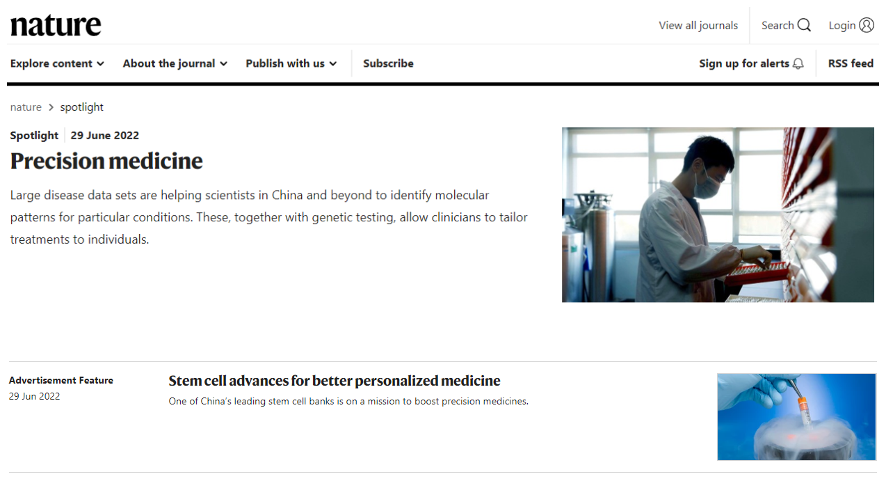 2022年6月29日,《Nature》官網nature spotlight增刊的“自然聚焦-中國精準醫(yī)療”板塊在線發(fā)表了北科生物首席科學家蔡車國教授團隊的主題文章:干細胞進展推動更好的個性化醫(yī)療。干細胞進展推動更好的個性化醫(yī)療