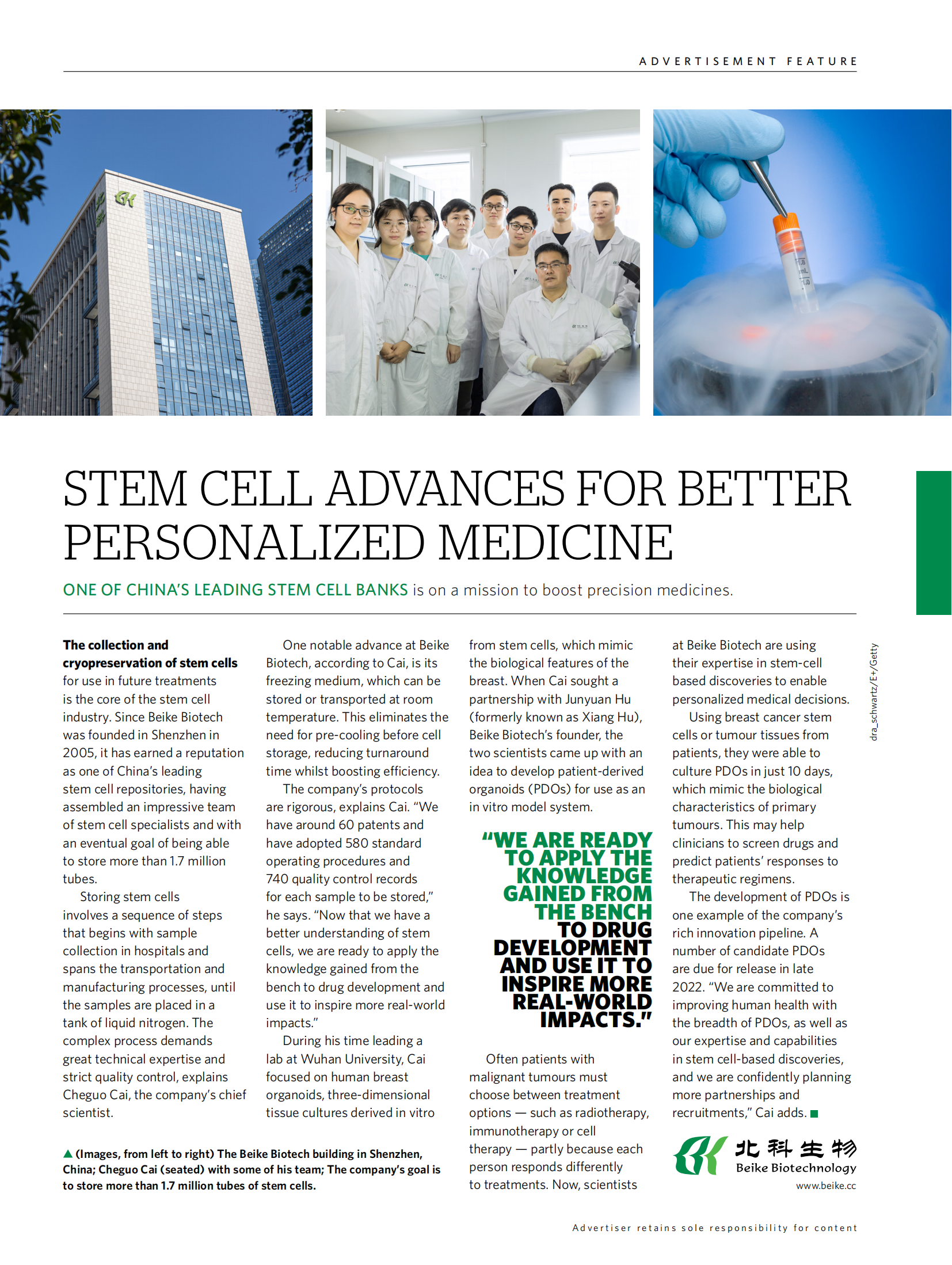 采集和凍存干細胞以用于未來的臨床治療是干細胞產業(yè)的核心。自2005年深圳市北科生物科技有限公司成立以來,公司已經贏得了“中國領先的干細胞儲存庫”的聲譽,組建了一支優(yōu)秀且經驗豐富的干細胞專家團隊。目前,公司在儲存業(yè)務上目標是讓更多家庭享受先進的細胞儲存服務。儲存干細胞涉及一系列嚴格的步驟,自醫(yī)院收集樣本開始,從運輸?shù)街苽?,直到樣本被儲存在液氮罐中,整個過程都要經過嚴格的管控。該公司的首席科學家蔡車國教授表示:“這一繁雜的過程,需要大量的專業(yè)技術人員的參與和嚴格的質量控制”。根據(jù)蔡教授介紹,“北科生物在儲存干細胞技術上的一個顯著優(yōu)勢是采用特殊的冷凍介質,它可以在室溫下儲存或運輸。這消除了細胞儲存前預冷的需要,減少了周轉時間,同時提高了效率?!?/section>“公司在儲存業(yè)務上的流程是極為嚴格的”,蔡教授解釋到,“我們有大約60項與干細胞制備、凍存相關的專利,通過約580多個標準操作程序和約740項質量控制記錄,嚴格對待每一份儲存的干細胞樣本。而如今,我們對干細胞有了更好的了解,已經做好充分的準備將從實驗室獲得的知識及技術應用于干細胞藥物的開發(fā),并利用它來激發(fā)對現(xiàn)實世界更多的影響?!?/section>蔡教授在武漢大學的實驗室研究團隊則專注于乳腺類器官的研究,即在體外利用干細胞培養(yǎng)技術獲得3D結構的培養(yǎng)物,該培養(yǎng)物呈現(xiàn)了乳腺的基因表達特點和形態(tài)結構特征。當深圳市北科生物科技有限公司的創(chuàng)始人胡雋源博士尋求與蔡教授合作時,這兩位科學家提出了一個合作想法,即開發(fā)病人來源的類器官模型(Patient Derived Organoid,PDO)作為體外疾病模型系統(tǒng)使用。惡性腫瘤患者在臨床治療時往往面臨選擇治療藥物和治療方案的困難,造成這種現(xiàn)象的部分原因是由于每個人對治療的反應程度不同,醫(yī)生需要邊治療邊調整?,F(xiàn)在,深圳市北科生物科技有限公司的科學家團隊,正在開發(fā)利用基于PDO模型的體外試藥系統(tǒng),有望未來為患者提供個性化、精準的治療方案。“PDO模型的技術開發(fā)是北科生物豐富的科技創(chuàng)新管線中的一個例子。一些候選的疾病PDO模型將于2022年底發(fā)布?!?/span>蔡教授補充說:“我們通過構建多種疾病和多種組織的PDO模型,以及在干細胞方面的研究發(fā)現(xiàn)和技術能力的積累來改善人類健康,我們歡迎更多志同道合的合作伙伴加入到這個行業(yè),共同為人類健康服務?!?/section>增刊系列報道:https://www.nature.com/collections/dbafabjahe