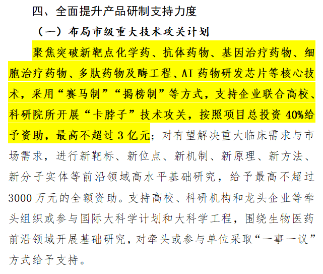 《措施》中重點(diǎn)提到,對(duì)基因治療藥物、細(xì)胞治療藥物等核心技術(shù),支持企業(yè)聯(lián)合高校、科研院所開展“卡脖子”技術(shù)攻關(guān),給予最高3億元的資助。