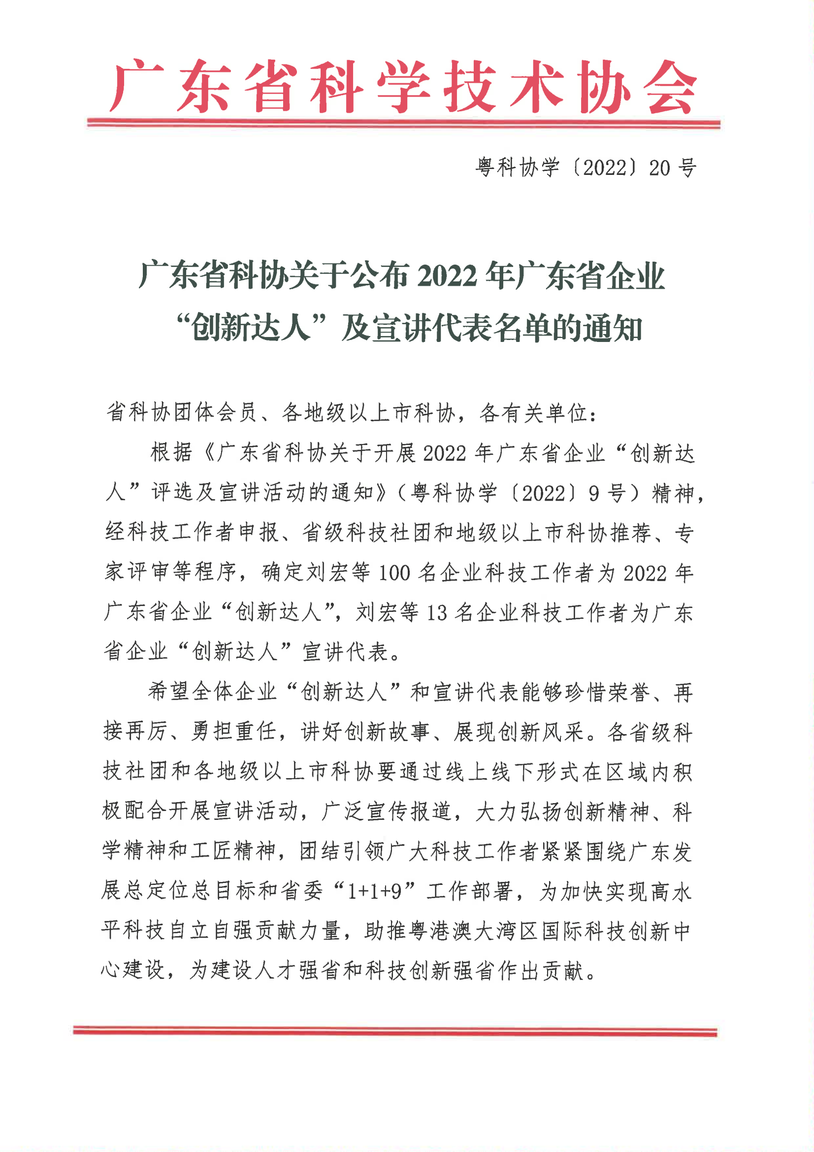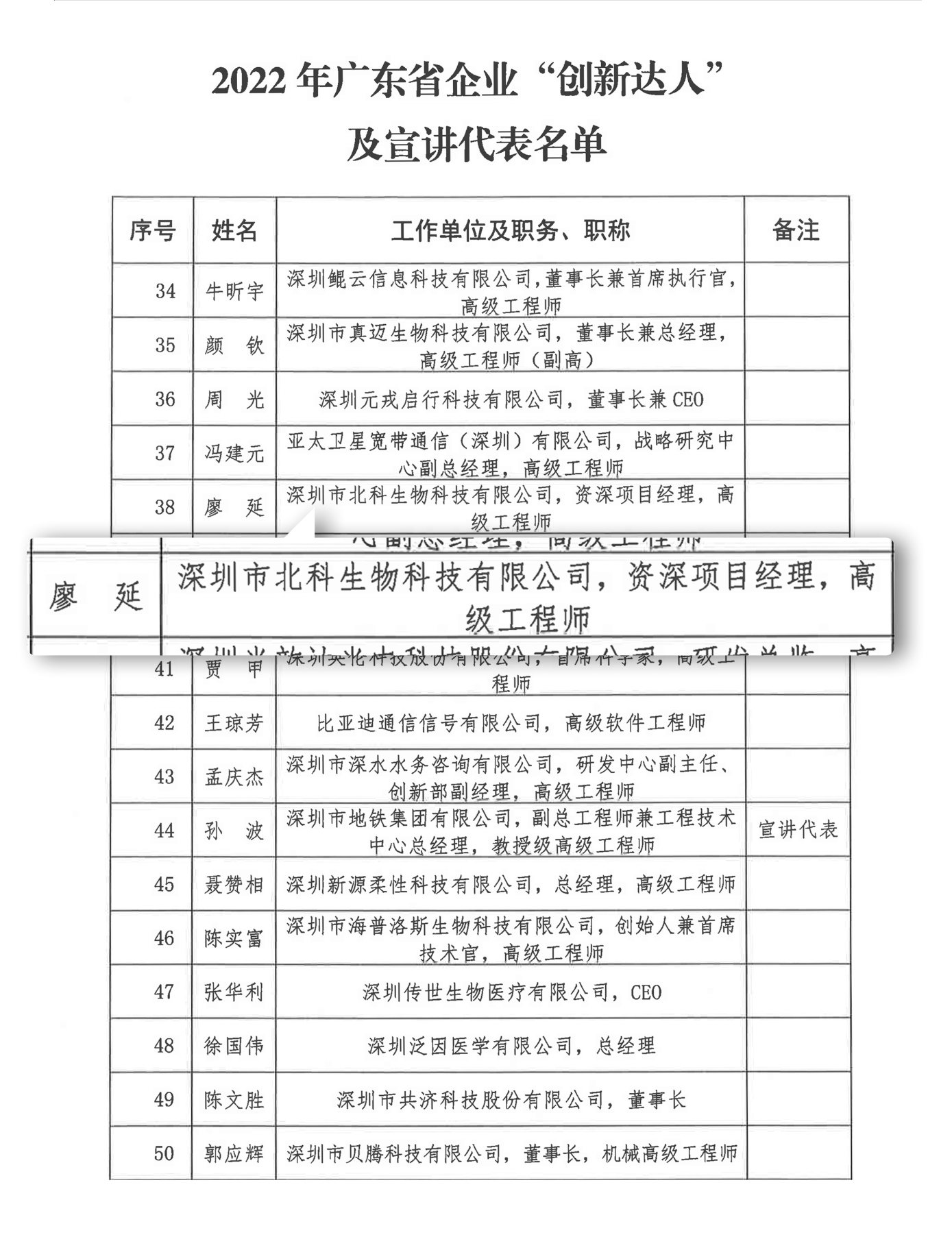 近日,根據(jù)中國科協(xié)關(guān)于開展2022年企業(yè)“創(chuàng)新達(dá)人”宣講活動的部署,廣東省科協(xié)開展2022年廣東省企業(yè)“創(chuàng)新達(dá)人”評選及宣講活動。深圳市北科生物科技有限公司研發(fā)中心高級工程師廖延博士榮獲廣東省企業(yè)“創(chuàng)新達(dá)人”稱號。